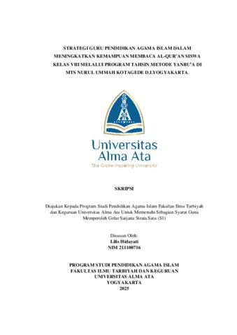 Hidayati, Lilis (2025) STRATEGI GURU PENDIDIKAN AGAMA ISLAM DALAM MENINGKATKAN KEMAMPUAN MEMBACA AL-QUR'AN SISWA KELAS VIII MELALUI PROGRAM TAHSIN METODE YANBU’A DI MTS NURUL UMMAH KOTAGEDE D.I.YOGYAKARTA. Skripsi thesis, UNIVERSITAS ALMA ATA YOGYAKARTA.