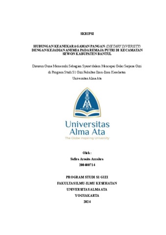 Azzahra, Safira Armita (2025) HUBUNGAN KEANEKARAGAMAN PANGAN (DIETARY DIVERSITY) DENGAN KEJADIAN ANEMIA PADA REMAJA PUTRI DI KECAMATAN SEWON KABUPATEN BANTUL. Skripsi thesis, UNIVERSITAS ALMA ATA YOGYAKARTA.