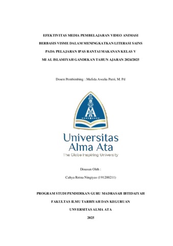 Ningtyas, Cahya Retna (2025) EFEKTIVITAS MEDIA PEMBELAJARAN VIDEO ANIMASI BERBASIS VISME DALAM MENINGKATKAN LITERASI SAINS PADA PELAJARAN IPAS RANTAI MAKANAN KELAS V MI AL ISLAMIYAH GANDEKAN TAHUN AJARAN 2024/2025. Skripsi thesis, UNIVERSITAS ALMA ATA YOGYAKARTA.