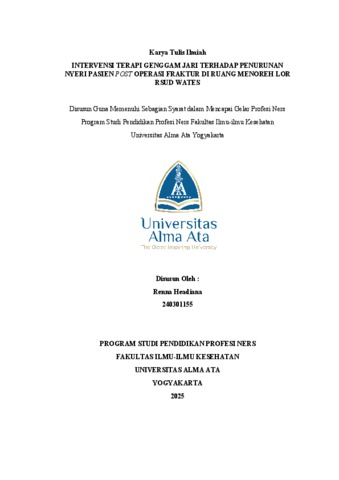 Headiana, Renna (2025) INTERVENSI TERAPI GENGGAM JARI TERHADAP PENURUNAN NYERI PASIEN POST OPERASI FRAKTUR DI RUANG MENOREH LOR RSUD WATES. Karya Tulis Ilmiah thesis, UNIVERSITAS ALMA ATA YOGYAKARTA.