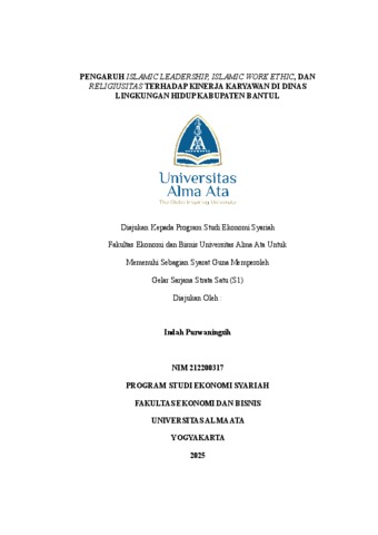 Purwaningsih, Indah (2025) PENGARUH ISLAMIC LEADERSHIP, ISLAMIC WORK ETHIC, DAN RELIGIUSITAS TERHADAP KINERJA KARYAWAN DI DINAS LINGKUNGAN HIDUP KABUPATEN BANTUL. Skripsi thesis, UNIVERSITAS ALMA ATA YOGYAKARTA.