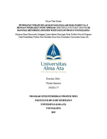 Santoso, Windu (2025) PENERAPAN TERAPI RELAKSASI NAFAS DALAM PADA PASIEN Tn. E DENGAN NYERI AKUT POST OPERASI URETEROLITHOTOMY DEXTRA DI BANGSAL MENOREH LOR RSUD WATES KULON PROGO YOGYAKARTA. Karya Tulis Ilmiah thesis, UNIVERSITAS ALMA ATA YOGYAKARTA.