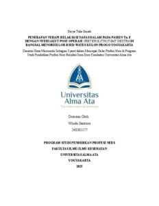 Latar Belakang : Prosedur pembedahan Ureterolithotomy dapat menimbulkan ketidaknyamanan, seperti rasa sakit dan reaksi tubuh terhadap trauma akibat operasi. Setelah operasi, pasien sering mengalami keluhan nyeri yang dapat menghambat proses penyembuhan. Salah satu metode nonfarmakologis yang efektif untuk mengurangi rasa nyeri adalah dengan menggunakan teknik relaksasi napas dalam. Tujuan : Untuk menilai efektivitas teknik relaksasi napas dalam, dalam mengurangi intensitas nyeri pada pasien pasca operasi ureterolithotomy dextra di Bangsal Bedah Menoreh Lor RSUD Wates Kulon Progo Yogyakarta. Metode Penelitian : Penelitian ini merupakan studi kasus dengan pendekatan deskriptif analitik. Subjek penelitian berjumlah 1 (satu orang) dengan pasien post-ureterolithotomy dekstra yang dirawat inap selama 3 (tiga) hari di Ruang Bangsal Manoreh Lor RSUD Wates, Kulon Progo. Hasil : Setelah diberikan intervensi teknik relaksasi napas dalam selama tiga hari, skala nyeri pasien mengalami penurunan dari angka 5 menjadi 3, berdasarkan pengukuran menggunakan skala nyeri numerik. Pada hari pertama penerapan terapi teknik relaksasi napas dalam tidak ada penurunan intensitas nyeri pada pasien. Akan tetapi pada hari kedua dan ketiga penerapan terapi teknik relaksasi napas dalam terdapat penurunan intensitas nyeri pasien post operasi ureterolithotomy. Kesimpulan: Teknik relaksasi napas dalam efektif dalam menurunkan tingkat nyeri pada pasien post-ureterolithotomy dekstra. Intervensi ini dapat menjadi salah satu pilihan terapi nonfarmakologi dalam manajemen nyeri pasca operasi. Keywords: Ureterolithotomy dextra, Teknik relaksasi napas dalam, manajemen nyeri