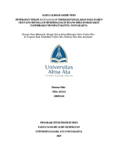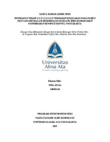 AULIA, NISA (2025) PENERAPAN TERAPI BACK MASSAGE TERHADAP KELELAHAN PADA PASIEN CKD YANG MENJALANI HEMODIALISA DI RUANG BIMA RUMAH SAKIT PANEMBAHAN SENOPATI BANTUL YOGYAKARTA. Karya Tulis Ilmiah thesis, UNIVERSITAS ALMA ATA YOGYAKARTA.