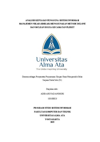 ANSHORI, ADIB ARSYAD (2025) ANALISIS KEPUASAN PENGGUNA SISTEM INFORMASMANAJEMEN NIKAH (SIMKAH) MENGGUNAKAN METODE DELONE DAN MCLEAN DI KUA KECAMATAN PLERET. Skripsi thesis, UNIVERSITAS ALMA ATA.