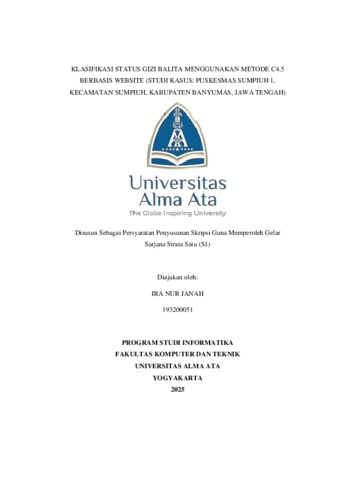 JANAH, IRA NUR (2025) KLASIFIKASI STATUS GIZI BALITA MENGGUNAKAN METODE C4.5 BERBASIS WEBSITE (STUDI KASUS: PUSKESMAS SUMPIUH 1, KECAMATAN SUMPIUH, KABUPATEN BANYUMAS, JAWA TENGAH). Skripsi thesis, UNIVERSITAS ALMA ATA.