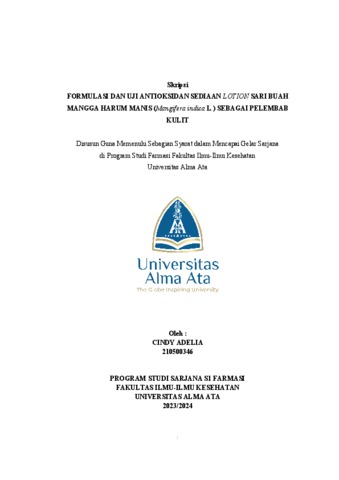 ADELIA, CINDY (2025) FORMULASI DAN UJI ANTIOKSIDAN SEDIAAN LOTION SARI BUAH MANGGA HARUM MANIS (Mangifera indica L.) SEBAGAI PELEMBAB KULIT. Skripsi thesis, UNIVERSITAS ALMA ATA.