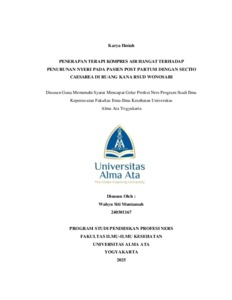 Muntamah, Wahyu Siti (2025) PENERAPAN TERAPI KOMPRES AIR HANGAT TERHADAP PENURUNAN NYERI PADA PASIEN POST PARTUM DENGAN SECTIO CAESAREA DI RUANG KANA RSUD WONOSARI. Karya Tulis Ilmiah thesis, UNIVERSITAS ALMA ATA YOGYAKARTA.