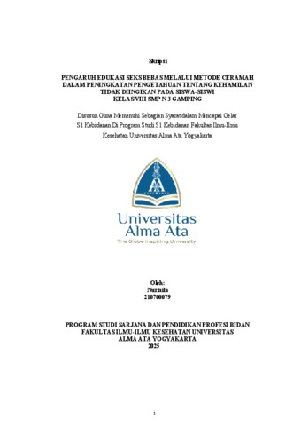 Nurlaila, Nurlaila (2025) PENGARUH EDUKASI SEKS BEBAS MELALUI METODE CERAMAH DALAM PENINGKATAN PENGETAHUAN TENTANG KEHAMILAN TIDAK DIINGIKAN PADA SISWA-SISWI KELAS VIII SMP N 3 GAMPING. Skripsi thesis, UNIVERSITAS ALMA ATA.