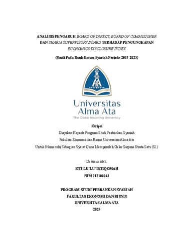 ISTIQOMAH, SITI LU’LU’ (2025) ANALISIS PENGARUH BOARD OF DIRECT, BOARD OF COMMISIONER DAN SHARIA SUPERVISORY BOARD TERHADAP PENGUNGKAPAN ECONOMICS DISCLOSURE INDEX (Studi Pada Bank Umum Syariah Periode 2019 2023). Skripsi thesis, UNIVERSITAS ALMA ATA.