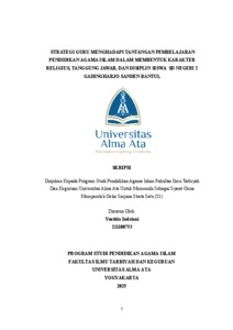 Yustitia Indriani: Strategi Guru Menghadapi Tantangan Pembelajaran Pendidikan Agama Islam Dalam Membentuk Karakter Religius, Tanggung Jawab, Dan Disiplin Siswa SD Negeri 2 Gadingharjo Sanden Bantul. Skripsi. Yogyakarta: Program Studi Pendidikan Agama Islam, Fakultas Ilmu Tarbiyah dan Keguruan. Universitas Alma Ata, 2025. Penelitian ini berfokus pada strategi guru dalam menghadapi tantangan pembelajaran Pendidikan Agama Islam untuk membentuk karakter religius, tanggung jawab, dan disiplin siswa kelas IV SDN 2 Gadingharjo. Penelitian ini menggunakan metode penelitian analisis deskriptif kualitatif, dengan teknik pengumpulan data melalui wawancara, observasi, dan dokumentasi. Tujuan penelitian ini adalah untuk mengetahui strategi yang digunakan oleh guru dalam mengembangkan karakter religius, tanggung jawab, dan disiplin siswa kelas IV SDN 2 Gadingharjo. Hasil penelitian ini menunjukkan bahwa, berbagai strategi yang digunakan guru PAI di SDN 2 Gadingharjo, termasuk strategi pembelajaran langsung, tidak langsung, interaktif, dan mandiri. Namun, strategi pembelajaran tidak langsung dengan metode pembiasaan dan keteladanan yang paling berdampak dalam mendorong siswa untuk menginternalisasi nilai-nilai karakter secara konsisten melalui contoh nyata dan kebiasaan positif sehari-hari. Adapun faktor pendukung guru PAI dalam mengembangkan karakter siswa kelas IV SDN 2 Gadingharjo mencakup beberapa hal yaitu, 1) suasana kelas yang nyaman, 2) kondisi siswa yang kondusif dan mampu bekerja sama, 3) penggunaan media pembelajaran yang tepat, dan 4) kegiatan ekstrakurikuler. Sementara faktor penghambatnya adalah, 1) lingkungan keluarga dan teman sebaya yang kurang mendukung, 2) tingkat kesadaran siswa yang berbeda-beda, dan 3) karakter dasar dan bawaan yang kuat. Kata Kunci: Strategi Pembelajaran, Pendidikan Agama Islam, Karakter Religius, Tanggung Jawab, Disiplin, SDN 2 Gadingharjo.