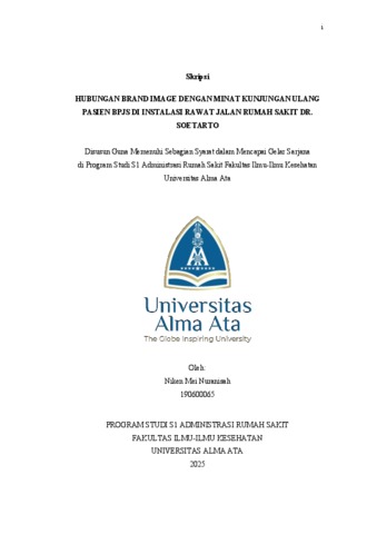 Nuranisah, Niken Mei (2025) HUBUNGAN BRAND IMAGE DENGAN MINAT KUNJUNGAN ULANG PASIEN BPJS DI INSTALASI RAWAT JALAN RUMAH SAKIT DR. SOETARTO. Skripsi thesis, UNIVERSITAS ALMA ATA.