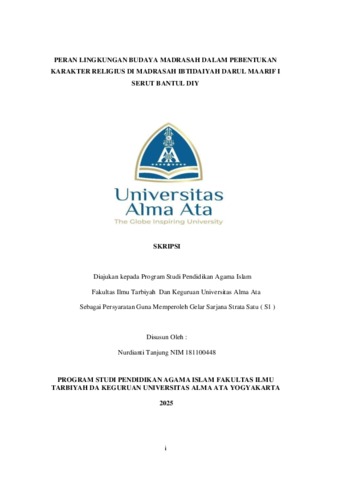 Tanjung, Nurdianti (2025) PERAN LINGKUNGAN BUDAYA MADRASAH DALAM PEBENTUKAN KARAKTER RELIGIUS DI MADRASAH IBTIDAIYAH DARUL MAARIF I SERUT BANTUL DIY. Skripsi thesis, UNIVERSITAS ALMA ATA.