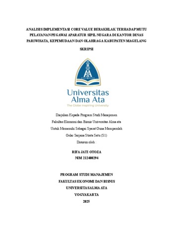 OTOZA, RIFA JATI (2025) ANALISIS IMPLEMENTASI CORE VALUE BERAKHLAK TERHADAP MUTU PELAYANAN PEGAWAI APARATUR SIPIL NEGARA DI KANTOR DINAS PARIWISATA, KEPEMUDAAN DAN OLAHRAGA KABUPATEN MAGELANG. Skripsi thesis, UNIVERSITAS ALMA ATA.