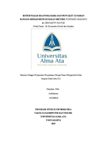 Arifrahman, Arifrahman (2025) SISTEM PAKAR DIAGNOSA HAMA DAN PENYAKIT TANAMAN BAWANG MERAH MENGGUNAKAN METODE FORWARD CHAINING & CERTAINTY FACTOR. Skripsi thesis, UNIVERSITAS ALMA ATA.