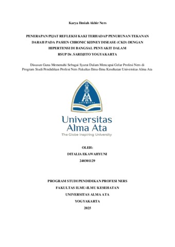 EKAWAHYUNI, DITALIA (2025) PENERAPAN PIJAT REFLEKSI KAKI TERHADAP PENURUNAN TEKANAN DARAH PADA PASIEN CHRONIC KIDNEY DISEASE (CKD) DENGAN HIPERTENSI DI BANGSAL PENYAKIT DALAM RSUP Dr. SARDJITO YOGYAKARTA. Karya Tulis Ilmiah thesis, UNIVERSITAS ALMA ATA.