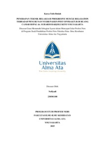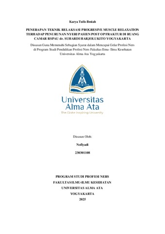 Nofiyadi, Nofiyadi (2025) PENERAPAN TEKNIK RELAKSASI PROGRESIVE MUSCLE RELAXATION TERHADAP PENURUNAN NYERI PASIEN POST OP FRAKTUR DI RUANG CAMAR RSPAU dr. SUHARDI HARJOLUKITO YOGYAKARTA. Karya Tulis Ilmiah thesis, UNIVERSITAS ALMA ATA.