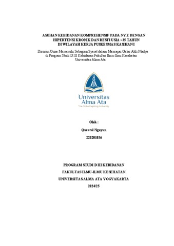 Nguyun, Qurotul (2025) ASUHAN KEBIDANAN KOMPREHENSIF PADA NY.E DENGAN HIPERTENSI KRONIK DAN RESTI USIA >35 TAHUN DI WILAYAH KERJA PUSKESMAS KASIHAN I. Karya Tulis Ilmiah thesis, UNIVERSITAS ALMA ATA.